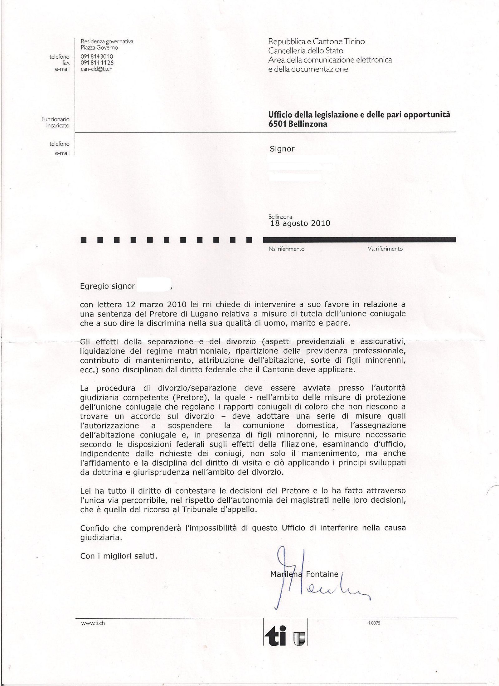 Un padre ticinese alcuni mesi fa ha scritto all'avv Fontaine Marilena (Capo Ufficio delle pari opportunità e della legislazione) chiedendo un intervento concreto per la sua situazione di padre in fase di separazione discriminato rispetto alla madre. Egli ha ricevuto la seguente risposta dall'avv Fontaine.....