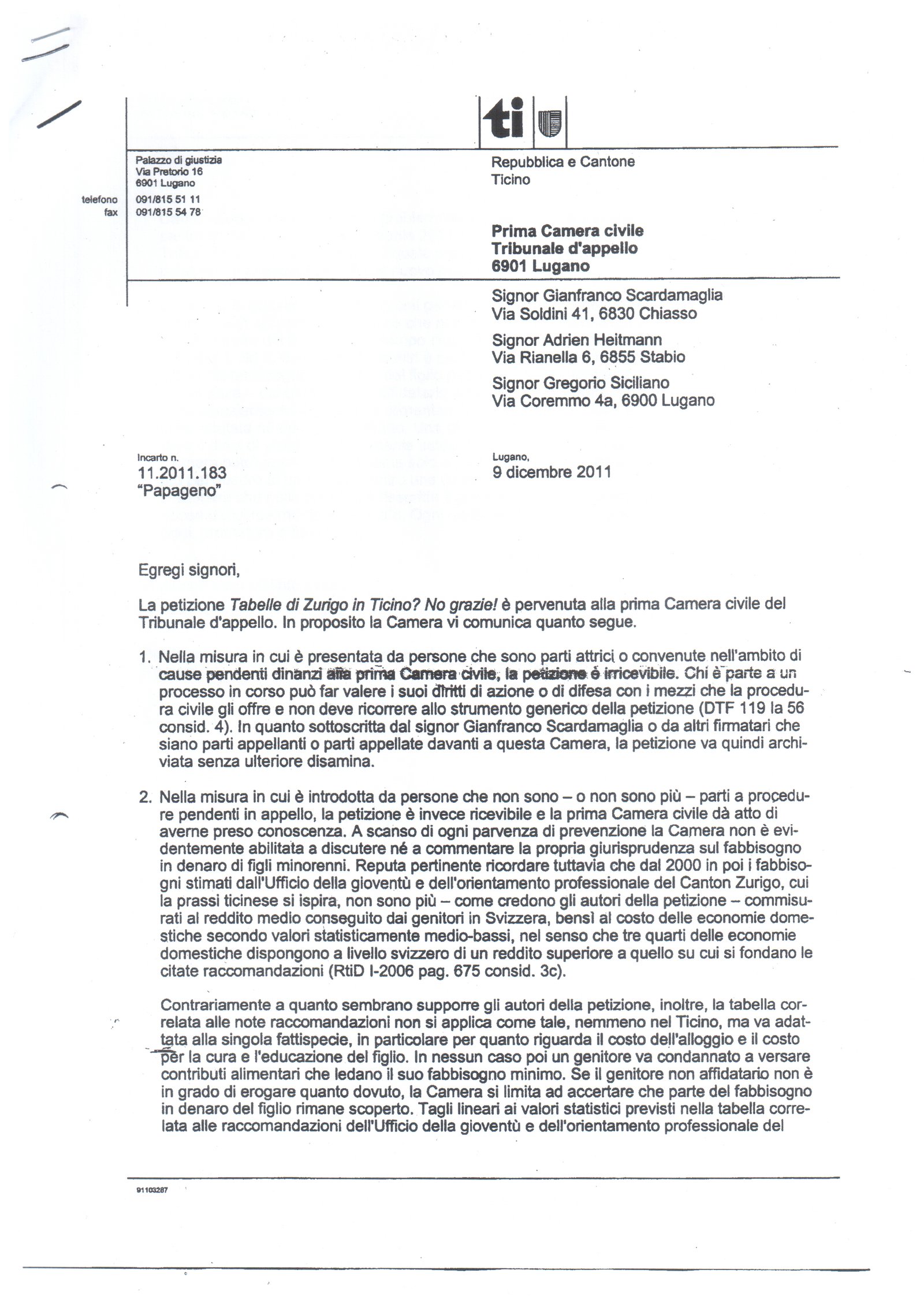 Petizione inviata ad inizio settembre 2011 ai Giudici della Ia Camera Ciile del Tribunale di appello di Lugano e cofirmata - da giugno a agosto 2011 - da circa 1'080 cittadini ( http://www.papagenonews.ch/administrator/components/com_media/images/mime-icon-32/pdf.png ).