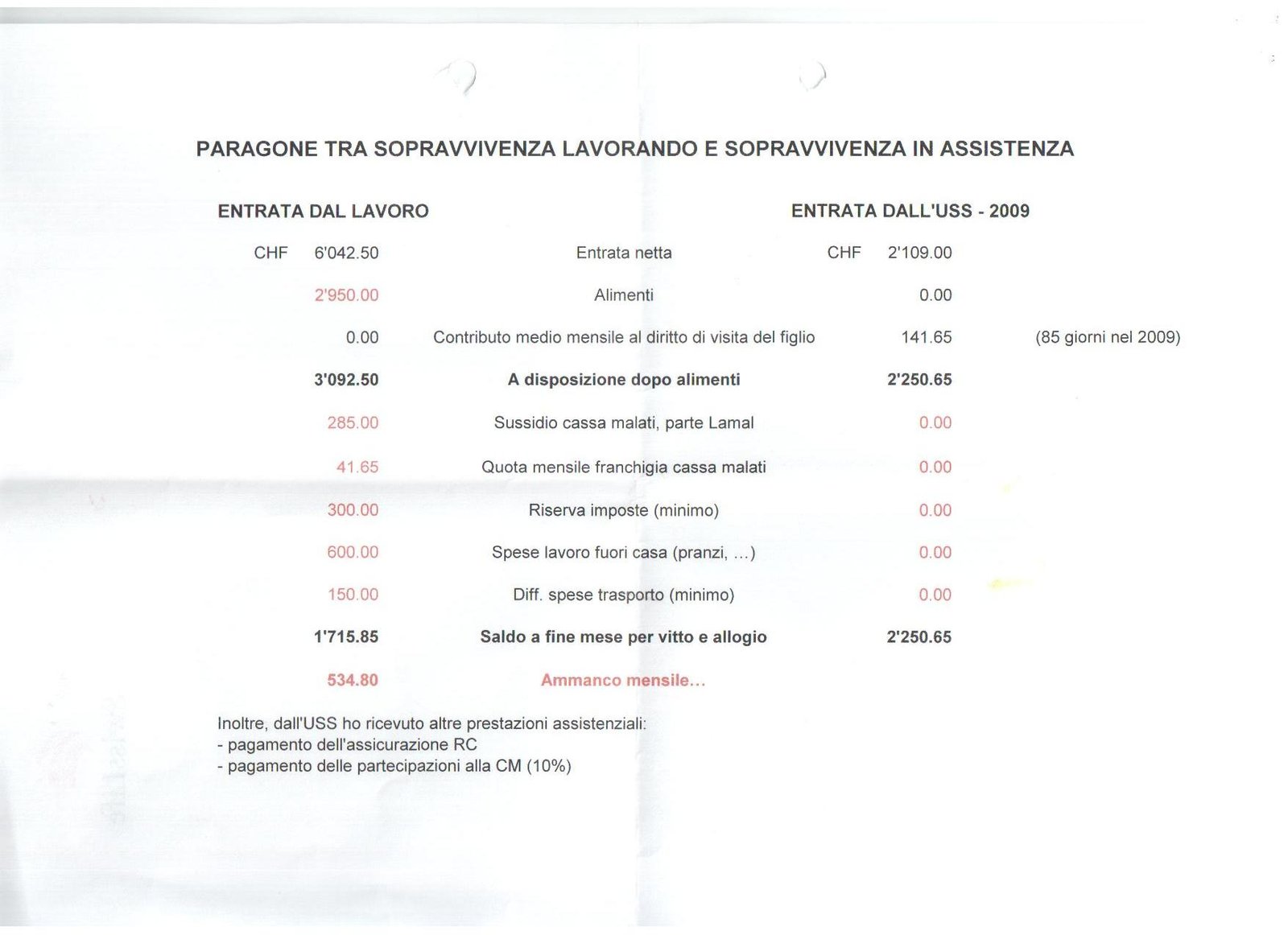 Calcolo del reddito e delle spese a confronto tra la situazione di sopravvivenza al minimo vitale di questo padre divorziato 49enne quando lavorava ed ora che è, suo malgrado, in assistenza. Paradossalmente, egli dispone di maggiori entrate (circa 550 fr mensili in più oltre ai costi per la salute presi a carico dall'assistenza statale) ora che è finito suo malgrado in assistenza e vive meno peggio di quando lavorava...